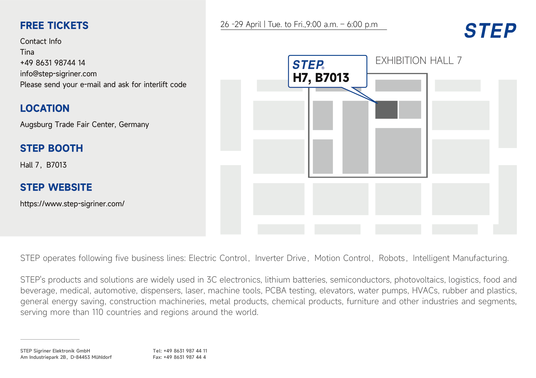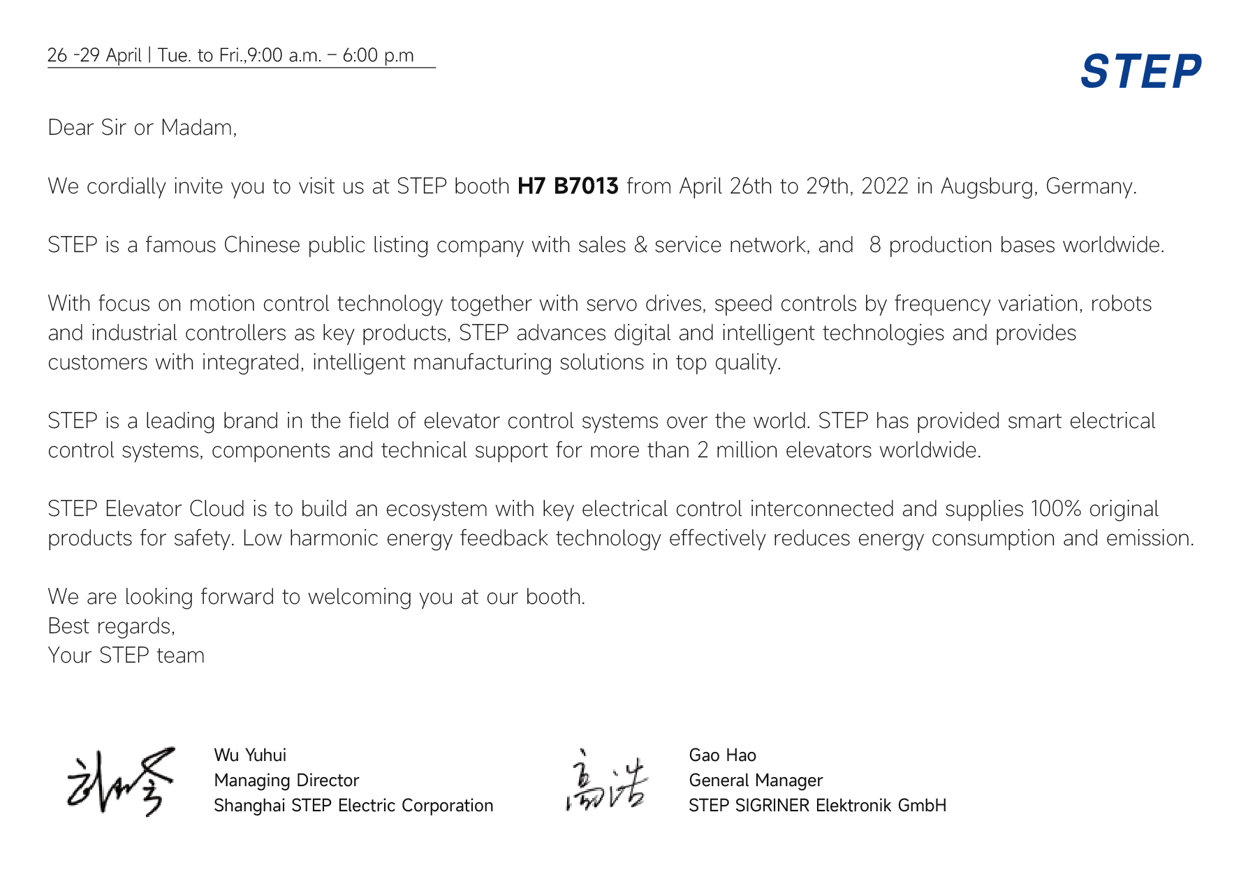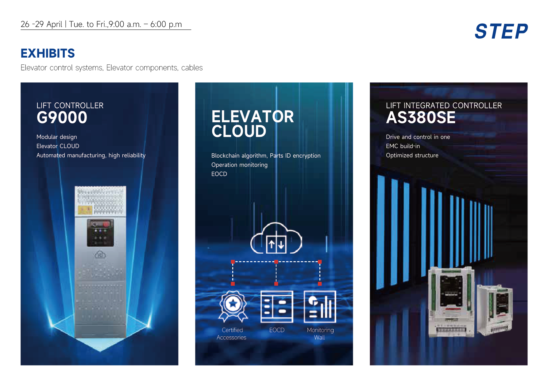 הפעם, STEP הופיעה בתערוכת המעליות באוגסבורג עם גישה חדשה, כשהיא מציגה את הטכנולוגיה והמוצרים העדכניים ביותר בתחום בקרת מעליות באותה במה עם מותגי המחלקה הראשונה בעולם, המייצגת ש-STEP תמשיך לפתח את השוק האירופי.
